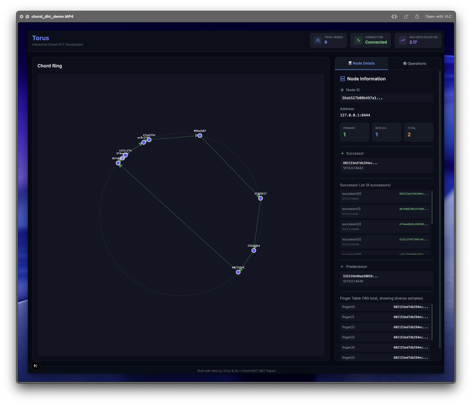 Production-ready Chord Distributed Hash Table with Go backend (gRPC, 8-way replication, O(log N) lookups) and Next.js real-time visualization dashboard. Complete implementation of MIT's Chord protocol with fault tolerance and interactive ring topology explorer.